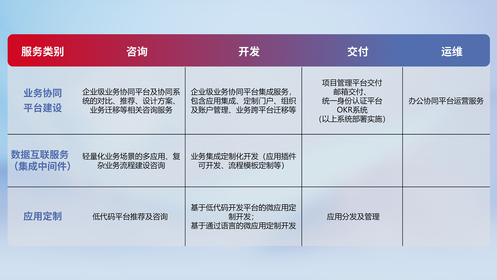 针对钉钉、、、、企微、、IDaas等平台级产品提供产品的规划、、、方案、、、交付、、、、定制化开发等服务,,,实现如统一协同办公、、、智能客户服务、、、混合会议管理、、智能数据查询、、等业务场景,,实现数字化转型。。。。